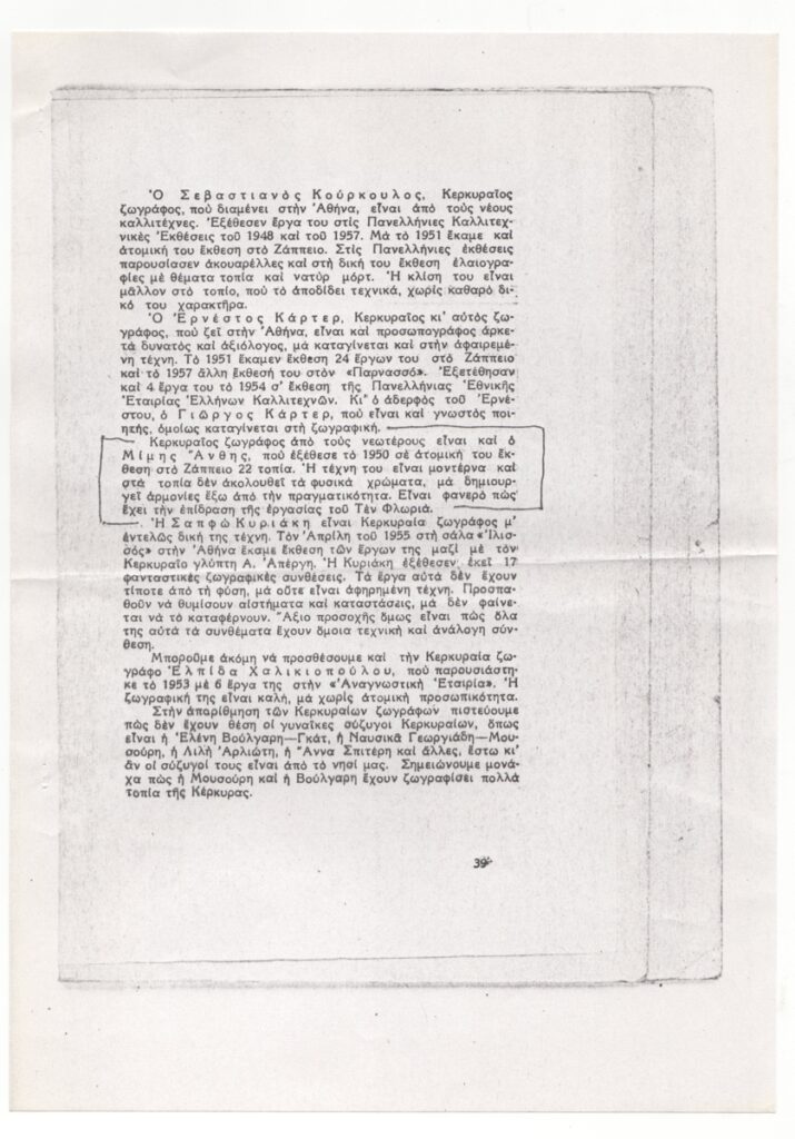 Φωτοαντίγραφο εξώφυλλου βιβλίου, έντυπο, στα ελληνικά, χαρτί, 29,6×21,0 εκ. Μονογραφία του Φώτου Γιοφύλλη, “Η ζωγραφική στην Κέρκυρα 1550-1958”, Έκδοσις “Κερκυραϊκών Χρονικών”, 1958. Επισυνάπτεται η σελ. 39 της μελέτης όπου περιλαμβάνεται το λήμμα για τον Δ. Άνθη, μαζί λήμματα για τους: Σεβαστιανό Κούρκουλο, Ερνέστο Κάρτερ, Σαπφώ Κυριάκη, Ελπίδα Χαλκιοπούλου, ενώ αναφορά γίνεται στην Ελένη Βούλγαρη-Γκάτ, Ναυσικά Γεωργιάδη-Μουσούρη, Λιλή Αρλιώτη, Άννα Σπητέρη.