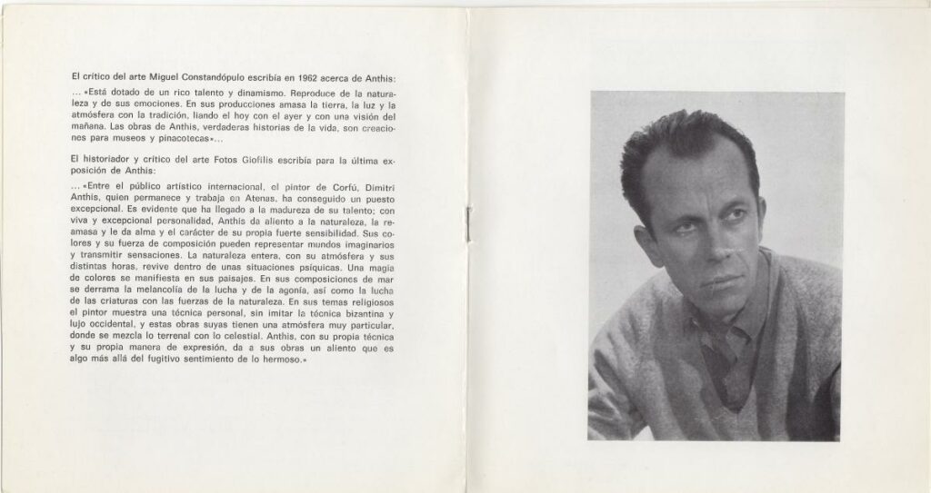 Φυλλάδιο έκθεσης του Δημήτρη Άνθη στην Sala Amadis στη Μαδρίτη Περιέχει βιογραφικό καλλιτέχνη και παραθέματα κειμένων των Julio Kaimi, Σπύρου Μελά, Μιχάλη Κωνσταντόπουλου και Φώτου Γιοφίλλη.