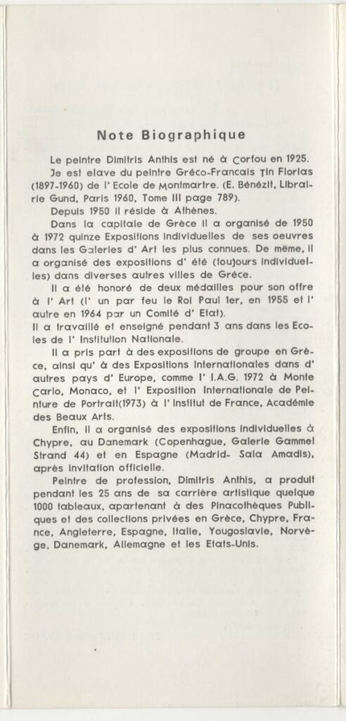 Φυλλάδιο της ατομικής έκθεσης του Δημήτρη Άνθη στην Art Galery του Hotel Galaxy Αθήνα. Περιέχει κατάλογο έργων, κριτική του Σπ. Παναγιωτόπουλου και του Β. Κουντουρίδη και βιογραφικό καλλιτέχνη σε τέσσερις γλώσσες.