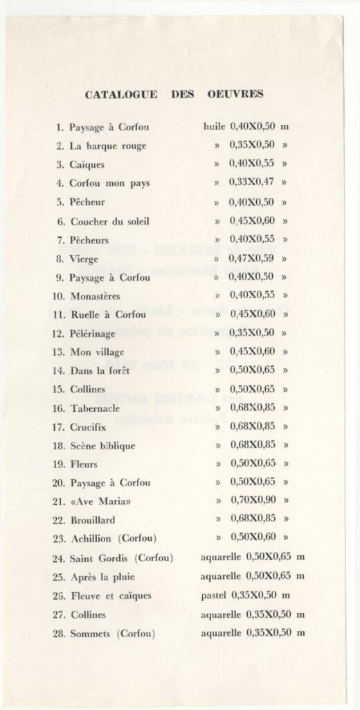 Κατάλογος ατομικής έκθεσης του Δημήτρη Άνθη στο Chapelle Santa-Maria-De-Olivo στο Beaulieu-sur-Mer. Περιλαμβάνονται 28 έργα (23 λάδια και 5 ακουαρέλλες) με τις διαστάσεις τους.