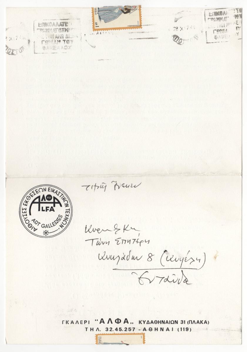 Πρόσκληση εγκαινίων της ατομικής έκθεσης του Δημήτρη Άνθη στην Αθήνα το 1974. Στην έκθεση παρουσιάστηκαν “λάδια, υδατογραφίες – συνθέσεις, τοπία, θαλασσογραφίες και μορφές”. Το έντυπο περιέχει σύντομο βιογραφικό καλλιτέχνη.