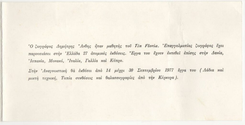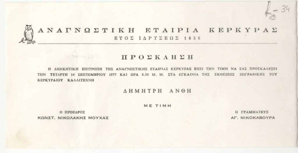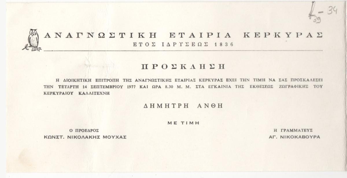 Πρόσκληση της ατομικής έκθεσης έργων του Δημήτρη Άνθη στην Αναγνωστική Εταιρεία Κέρκυρας.