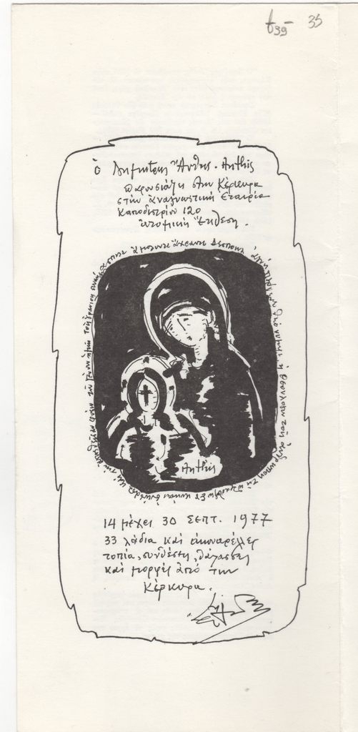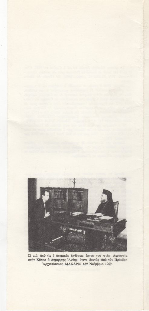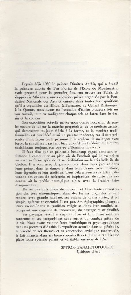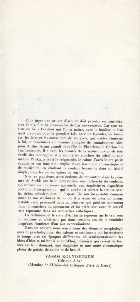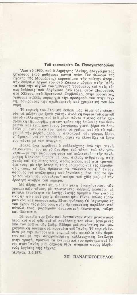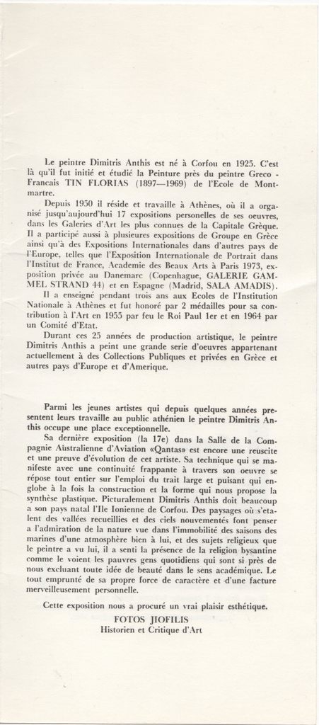 Έντυπο, πολύπτυχο, χαρτόνι, 28,2×12,7 εκ., στα ελληνικά. Φυλλάδιο της ατομικής έκθεσης έργων του Δημήτρη Άνθη στην Κέρκυρα το 1977. Περιέχει κείμενα των Β. Κουντουράκη (στα ελληνικά και τα γαλλικά), Σπύρου Παναγιωτόπουλου (στα ελληνικά και τα γαλλικά) και του Φώτου Γιοφύλλη (στα γαλλικά). Επιγραφή.