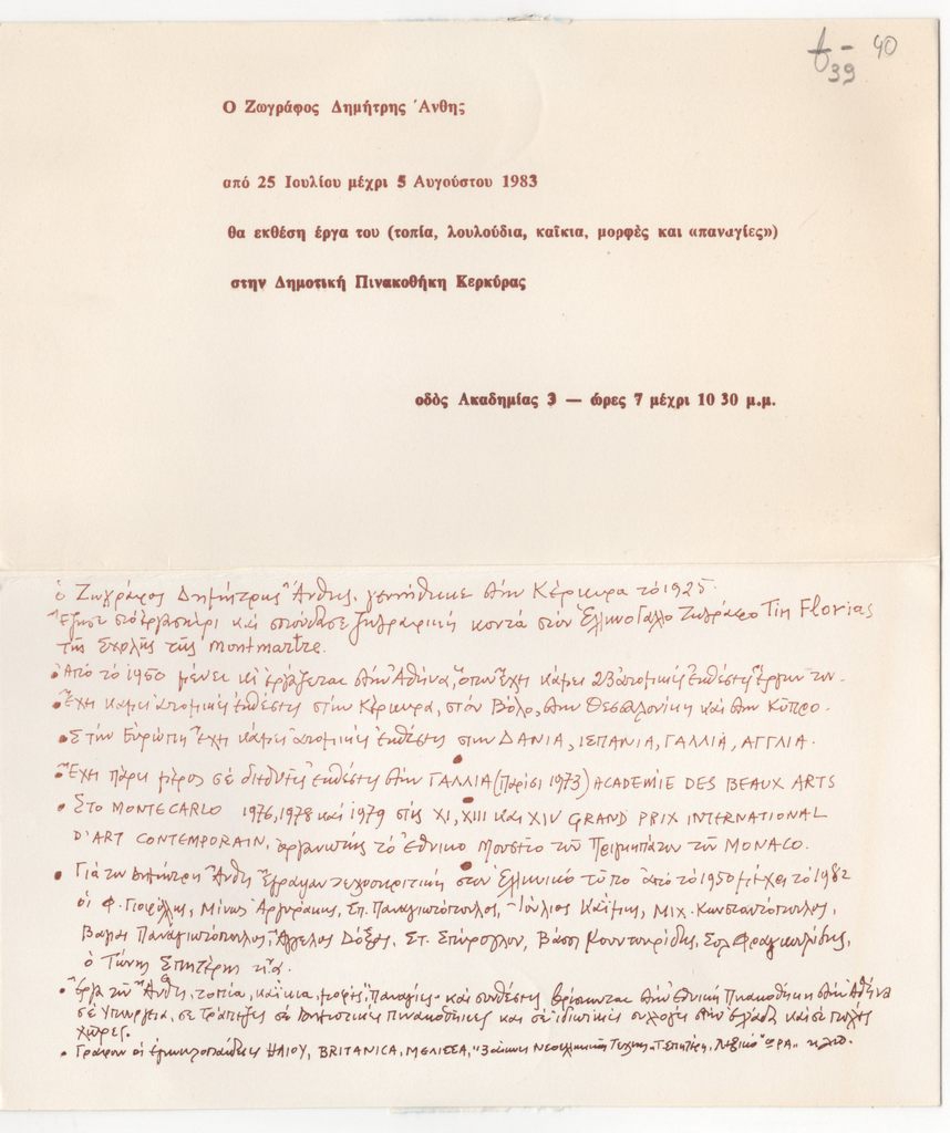 Έντυπο, δίπτυχο, χαρτόνι, 11,5×19,8 εκ., στα ελληνικά. Φυλλάδιο της ατομικής έκθεσης του Δημήτρη Άνθη στην Κέρκυρα το 1983. Περιέχει σύντομο βιογραφικό καλλιτέχνη. Εξωτερικά επιγραφή με τα στοιχεία του ζεύγου Σπητέρη στην Αθήνα ως παραληπτών της πρόσκλησης.