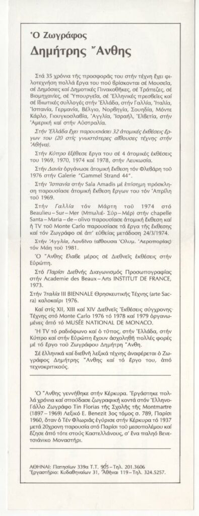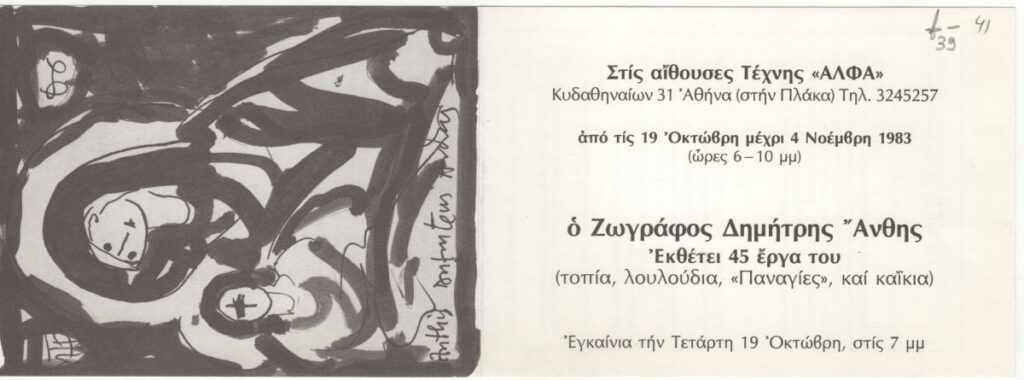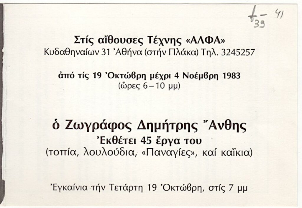 Πρόσκληση της ατομικής έκθεσης έργων του Δημήτρη Άνθη στην Αίθουσα Τέχνης “Άλφα” στην Αθήνα. Παρουσιάζονται 45 έργα (τοπία, λουλούδια, «Παναγίες», και καΐκια). Περιέχει βιογραφικό καλλιτέχνη. Εικονογραφείται με αναπαραγωγή έργου.