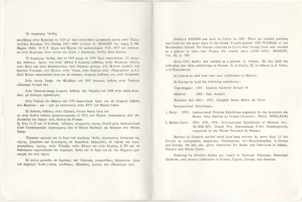 Πρόσκληση της ατομικής έκθεσης έργων του Δημήτρη Άνθη στο Corfu Palace στην Κέρκυρα. Περιέχει βιογραφικό καλλιτέχνη. Εικονογραφείται με φωτογραφία του καλλιτέχνη. Απεσταλμένη στο ζεύγος Σπητέρη.