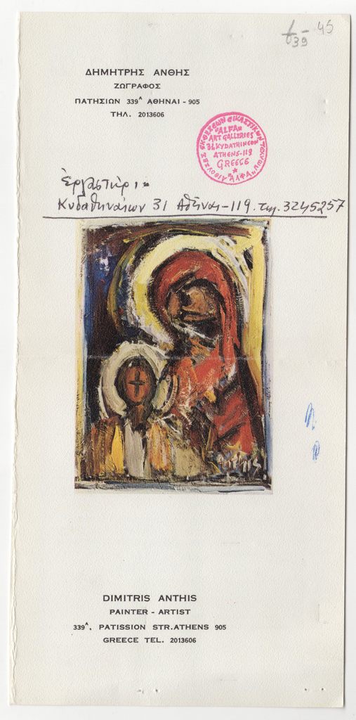 Απόκομμα, έντυπο, χαρτόνι, 24,2×11,4 εκ., στα ελληνικά. Φυλλάδιο με στοιχεία για τον ζωγράφο Δημήτρη Άνθη. Περιέχει βιογραφικό καλλιτέχνη. Εικονογραφείται με αναπαραγωγή έργου. Επιγραφές.