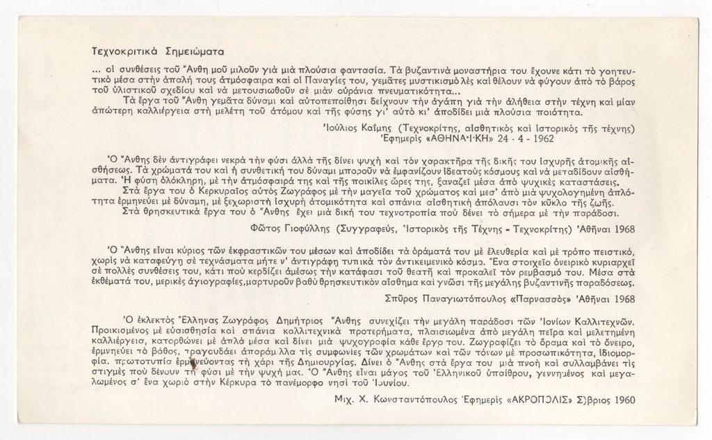 Έντυπο, μονόφυλλο, χαρτόνι, 25,0×15,0 εκ., στα ελληνικά. Περιέχει κατάλογο ατομικών εκθέσεων της περιόδου 1947-1969. Στην πίσω όψη παραθέματα κριτικών διαφόρων του Ιούλιου Καΐμη (Εφημερίς “ΑΘΗΝΑΪΚΗ”, 24/04/1962), Φώτου Γιοφύλλη (Αθήναι 1968), Σπύρου Παναγιωτόπουλου (“Παρνασσός” Αθήναι 1968) και Μιχ. Χ. Κωνσταντόπουλοθ (Εφημερίς “ΑΚΡΟΠΟΛΙΣ” Σ/βριος 1960). Επιγραφές.