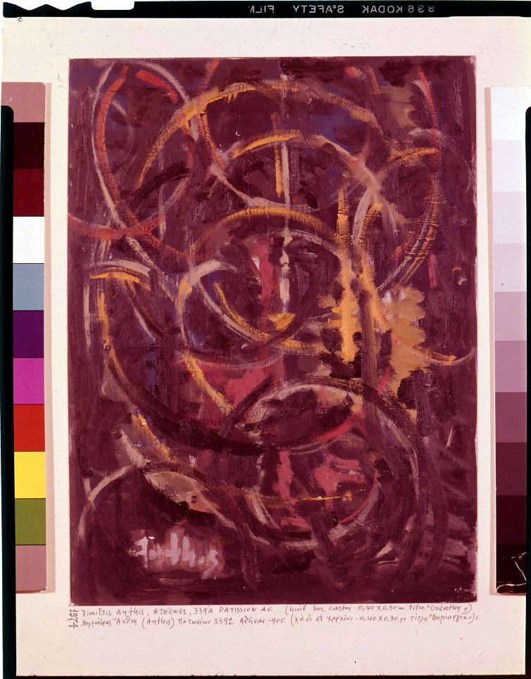 Διαφάνεια, έγχρωμη, θετικό φιλμ, χωρίς πλαίσιο, 12,5×11,0 εκ. Αναπαραγωγή έργου του Δημήτρη Άνθη. Πάνω στην διαφάνεια, κάτω από το έργο επιγραφή με τα στοιχεία του έργου
