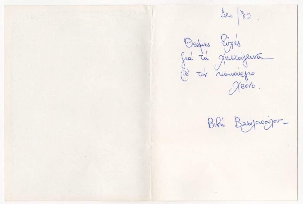 Κάρτα, έντυπη, δίπτυχο, χαρτόνι, 16,2×12,5 εκ. Εξωτερικά, αναπαραγωγή έργου του Δημήτρη Άνθη. Εσωτερικά χειρόγραφες ευχές για τα Χριστούγεννα και το Νέο Έτος από την Β. Βασιλοπούλου.