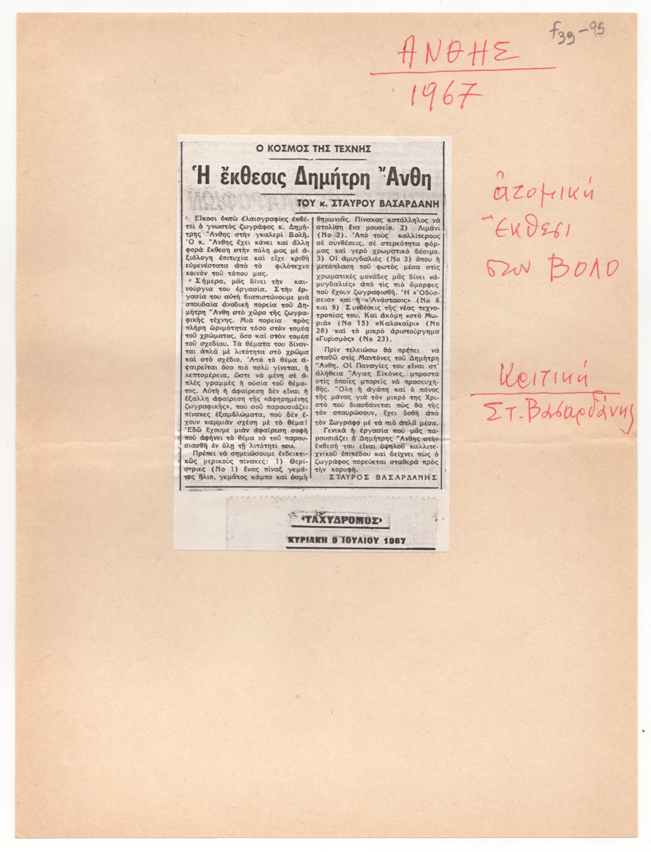 Φωτοαντίγραφο αποκόμματος, έντυπο, χαρτί, 14,3×9,6 εκ., όπου δημοσιεύεται, στα ελληνικά, κριτική για την ατομική έκθεση του Δημήτρη Άνθη στον Βόλο το 1967. Επικολλημένο σε φύλλο χαρτιού, 28,5×21,5 εκ., όπου επιγραφή με τα στοιχεία της δημοσίευσης.