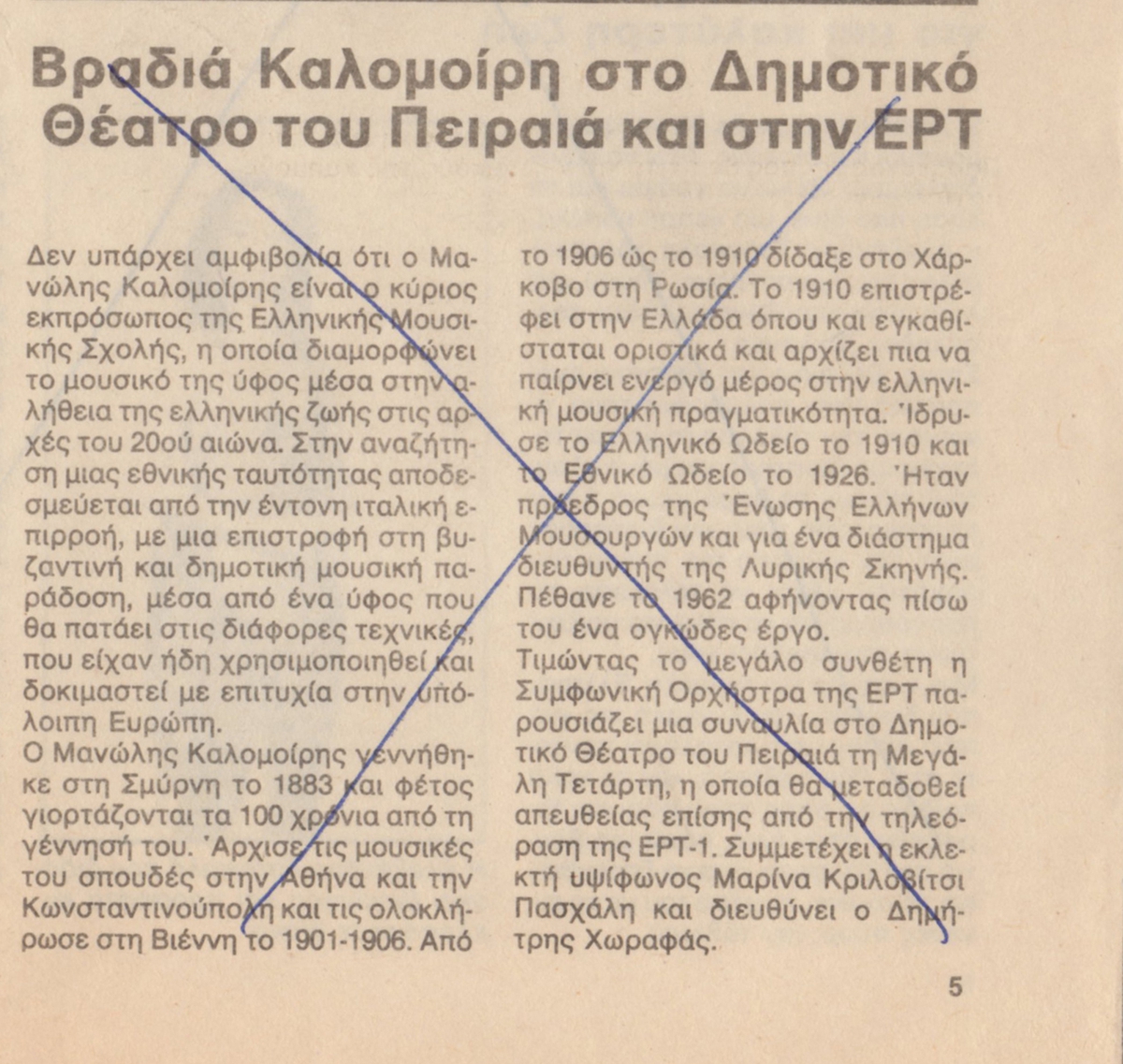 Απόκομμα, χαρτί, 21,5×15 εκ., στα ελληνικά, δημοσίευσης άρθρου που αναφέρεται σε συναυλία με έργα του Μανώλη Καλομοίρη από την Συμφωνική Ορχήστρα της ΕΡΤ.