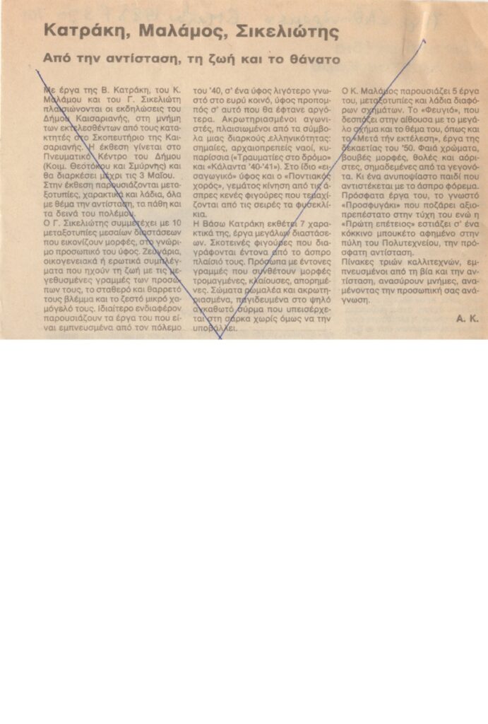 Απόκομμα, χαρτί, 21,5×15 εκ., στα ελληνικά, δημοσίευσης άρθρου που αναφέρεται σε ομαδική έκθεση των Βάσω Κατράκη, Κώστα Μαλάμου και Γιώργου Σικελιώτη, στο πλαίσιο εκδηλώσεων στου Δήμου Καισαριανής στη μνήμη των εκτελεσθέντων από τους κατακτητές στο εκεί σκοπευτήριο.