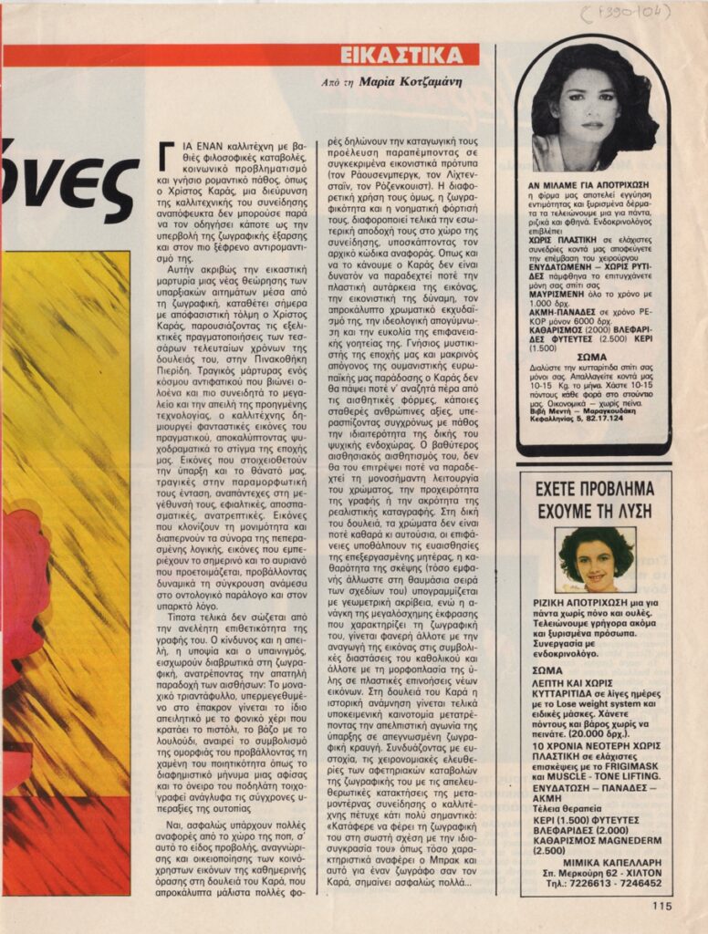 Απόκομμα, χαρτί, 2 φφ, 30×22,5 εκ., στα ελληνικά, δημοσίευσης κριτικής έκθεσης του Χρίστου Καρά, η οποία διεξάγεται στην Πινακοθήκη Πιερίδη στην Αθήνα. Το απόκομμα εικονογραφείται και φέρει επιγραφές. Στο ίδιο, διαφήμιση “Μιμίκα Καπελλάρη”.