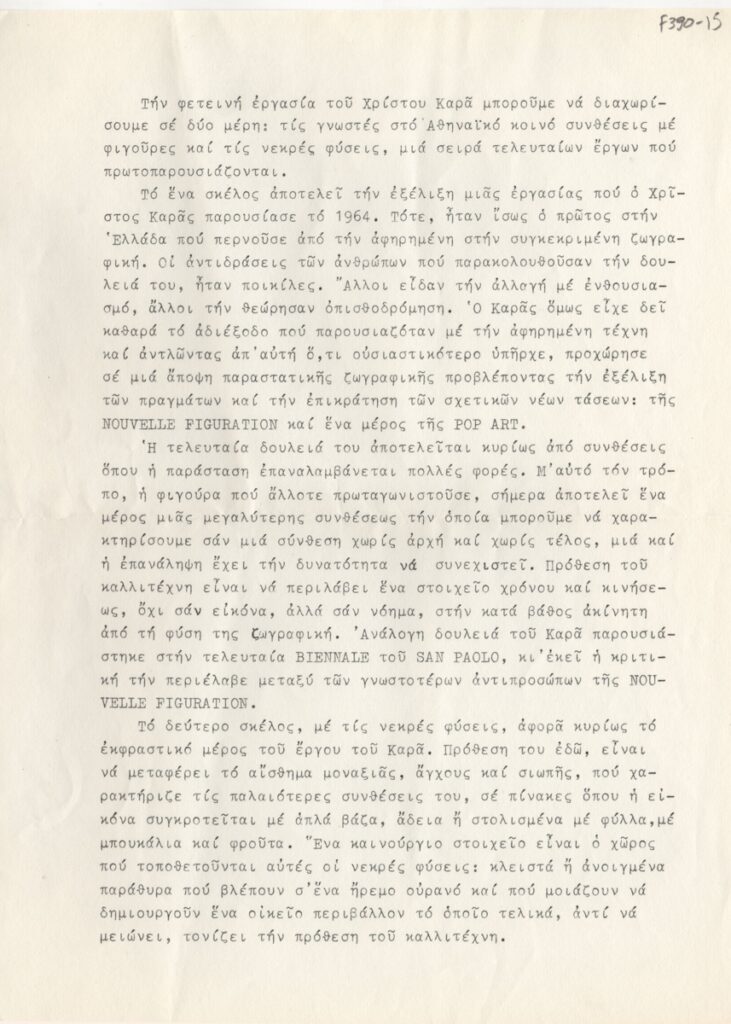 Κείμενο, δακτυλόγραφο, χαρτί, 28,5×21 εκ., στα ελληνικά, για τις καλλιτεχνικές συνθέσεις που παρουσιάζει ο Χρίστος Καράς (φιγούρες και νεκρές φύσεις).