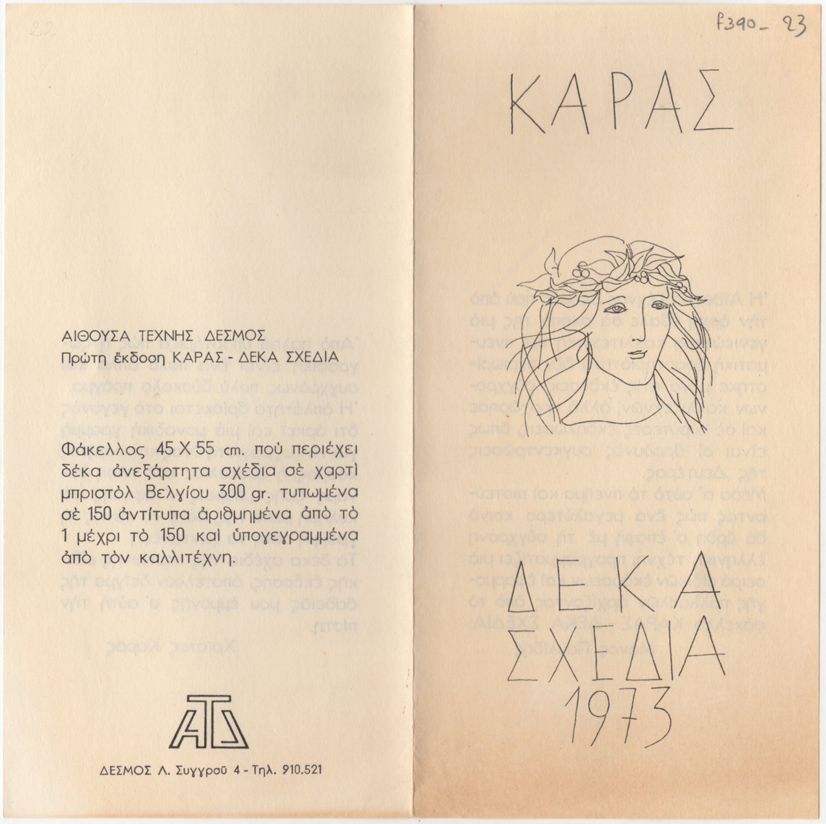 Έντυπο, χαρτί αναδιπλωμένο, 20×10 εκ., στα ελληνικά, ατομικής έκθεσης του Χρίστου Καρά. Περιέχει κείμενο του Μάνου Παυλίδη, το οποίο αναφέρεται στην έκθεση και την έκδοση της Γκαλερί με σχέδια του καλλιτέχνη. Επίσης περιέχει κείμενο του καλλιτέχνη.