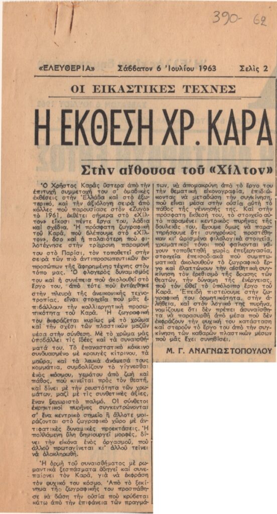 Απόκομμα, χαρτί, 21×11.5 εκ., στα ελληνικά, δημοσίευσης κριτικής έκθεσης του Χρίστου Καρά, η οποία διεξάγεται στην Αίθουσα Τέχνης Αθηνών Χίλτον.