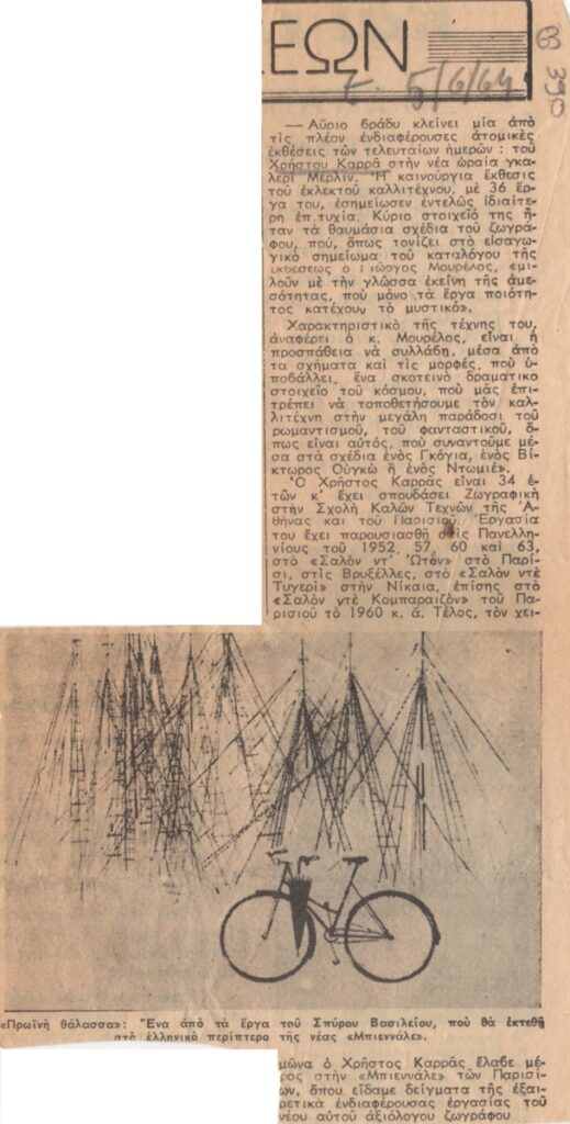 Απόκομμα, χαρτί, 20×11 εκ., στα ελληνικά, δημοσίευσης κριτικής έκθεσης του Χρίστου Καρά, η οποία διεξάγεται στην Γκαλερί Μέρλιν στην Αθήνα.