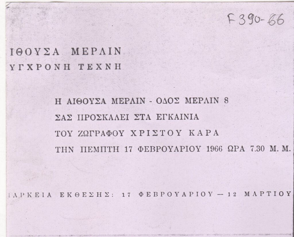 Φωτοαντίγραφο, χαρτί, 29.5×21 εκ., στα ελληνικά, πρόσκλησης ατομικής έκθεσης του Χρίστου Καρά.