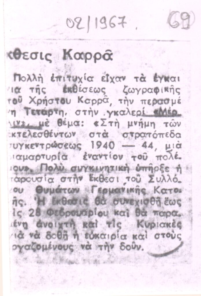 Φωτοαντίγραφο, χαρτί, 29.5×21 εκ., στα ελληνικά, δημοσίευσης κριτικής έκθεσης του Χρίστου Καρά, η οποία διεξάγεται στην Γκαλερί Μέρλιν, στην Αθήνα.