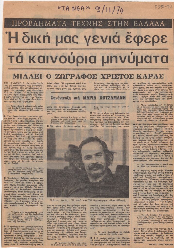 Απόκομμα, χαρτί, 29×20,5 εκ., στα ελληνικά, σημοσίευσης συνέντευξης του Χρίστου Καρά. Ο καλλιτέχνης απαντά σε ερωτήσεις αναφορικά με τη γενιά του και την Τέχνη. Η συνέντευξη εντάσσεται σε έρευνα του εντύπου με συζητήσεις με καλλιτέχνες της μεταπολεμικής γενιάς. Το απόκομμα εικονογραφείται και φέρει επιγραφές.