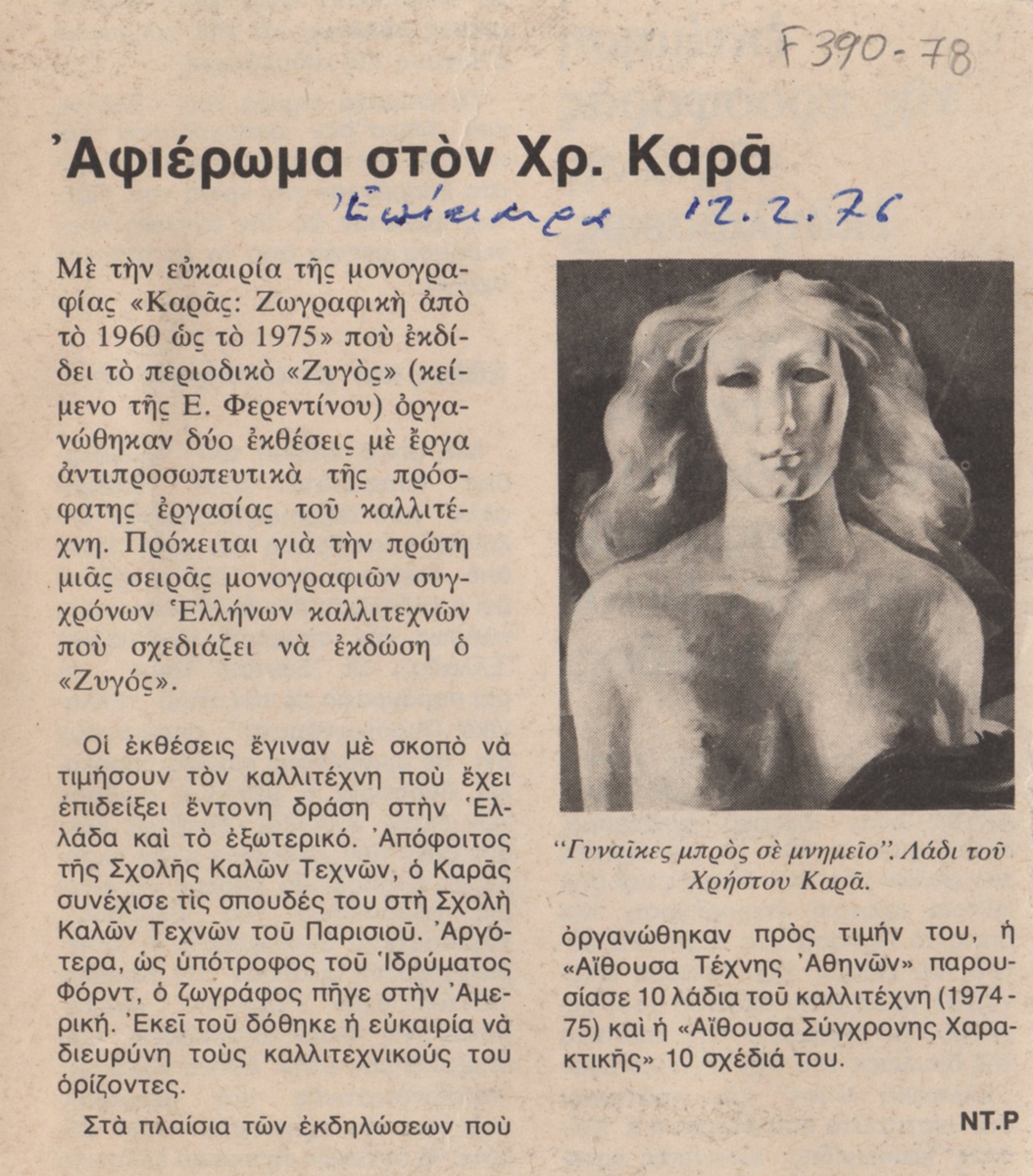 Απόκομμα, χαρτί, 13,5×12,5 εκ., στα ελληνικά, δημοσίευσης άρθρου που αναφέρεται σε δύο εκθέσεις που διοργανώθηκαν προς τιμήν του Χρίστου Καρά, με αφορμή έκδοση μονογραφίας του περιοδικού Ζυγός για τα 15 έτη της καλλιτεχνικής του πορείας.