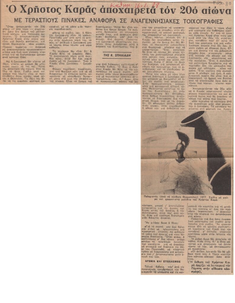Απόκομμα, χαρτί, 33×25 εκ., στα ελληνικά, δημοσίευσης κριτικής ατομικής έκθεσης του Χρίστου Καρά, η οποία διεξάγεται στην Αίθουσα Τέχνης Δεσμός, στην Αθήνα.