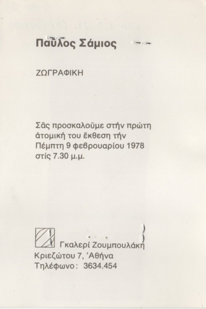 Απόκομμα, χαρτόνι, 16×11 εκ., στα ελληνικά, πρόσκλησης εγκαινίων ατομικής έκθεσης ζωγραφικής του Παύλου Σάμιου.