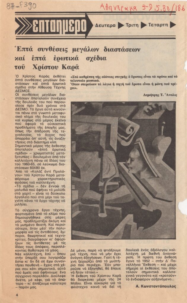 Απόκομμα, χαρτί, 22×14 εκ., στα ελληνικά, δημοσίευσης κριτικής έκθεσης του Χρίστου Καρά, η οποία διεξάγεται στην Αίθουσα Τέχνης Δεσμός στην Αθήνα.
