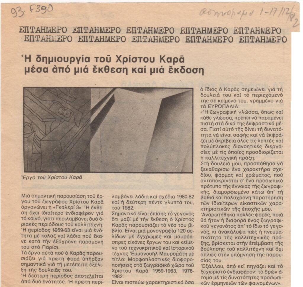 Απόκομμα, χαρτί, 14,5×15 εκ., στα ελληνικά, δημοσίευσης κριτικής έκθεσης του Χρίστου Καρά, η οποία διεξάγεται στην Galerie 3 στην Αθήνα. Στο ίδιο σχολιάζεται έκδοση μονογραφίας για τον καλλιτέχνη, με κείμενα του Εμμανουήλ Μαυρομμάτη.