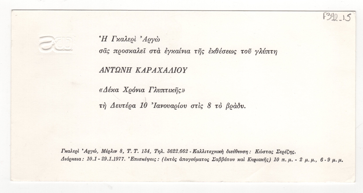 Έντυπο, στα ελληνικά, μονόφυλλο, χαρτόνι, 10,0×19,8 εκ. Αφορά την ατομική έκθεση γλυπτικής του Αντώνη Καραχάλιου στην Αθήνα τον χειμώνα του 1977.