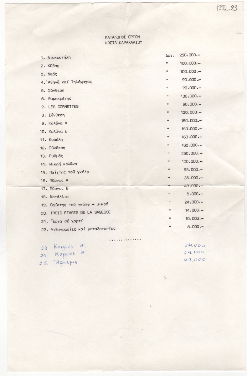 Κείμενο, δακτυλόγραφο, με χειρόγραφες προσθήκες, με μπλε μελάνι, στα ελληνικά, χαρτί, 34,0×21,8 εκ. Τιμοκατάλογος έργων του γλύπτη και ζωγράφου Κωνσταντίνου Καραχάλιου από έκθεση που δεν προσδιορίζεται.