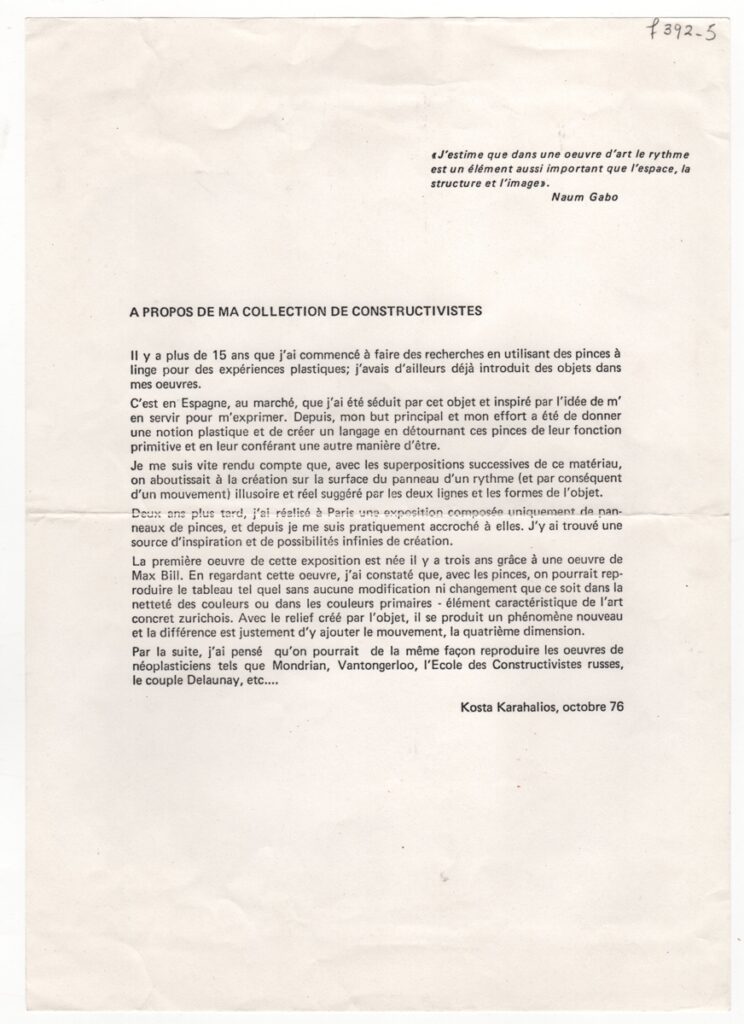 Φωτοαντίγραφο αποκόμματος εντύπου (έκθεσης;), στα γαλλικά, χαρτί, 29,7×21,0 εκ. Κείμενο του Κωνστανστίνου Καραχάλιου για το έργο του γραμμένο τον Οκτώβριο του 1976. Πάνω δεξιά απόσπασμα κειμένου του ρώσου γλύπτη Naum Gabo.