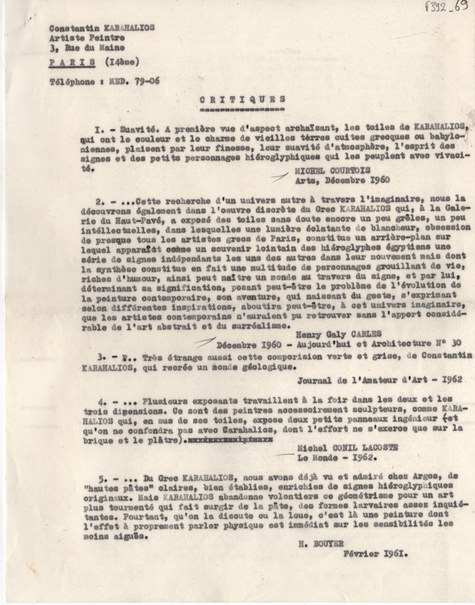 Κείμενο, δακτυλόγραφο, στα γαλλικά και αγγλικά, σε χαρτί, 4 φφ, 27,0×21,0 εκ. Αποδελτίωση κριτικών για τον Κωνσταντίνο Καραχάλιο συγκεντρωμένες από τον ίδιο τον καλλιτέχνη. Οι κριτικές καλύπτουν την περίοδο 1960-1964.