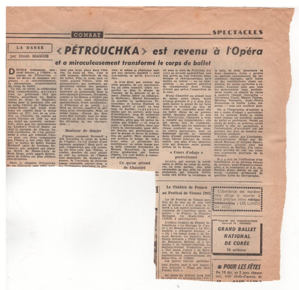 Απόκομμα, έντυπο, χαρτί, 26,3×27,4 εκ., όπου δημοσιεύεται, στα γαλλικά, κριτική από την Dinah Maggie για την παραγωγή του μπαλέτου Pétroucha από την Opéra του Παριστιού. το 1964 Στην άλλη όψη κριτική του Fr. Pluchart για την έκθεση των Damian, Καραχάλιου, Piaubert και Τàpies στο Παρίσι το 1964.