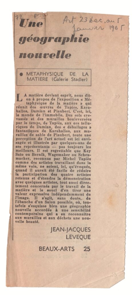 Απόκομμα, έντυπο, χαρτί, 20,6×8,8 εκ., όπου δημοσιεύεται, στα γαλλικά, κριτική του Jean-Jacques Lévêque για την ομαδική έκθεση των Damian, Καραχάλιου, Piaubert και Tàpies στο Παρίσι το 1965. Πάνω από τον τίτλο επιγραφή με τα στοιχεία δημοσίευσης.