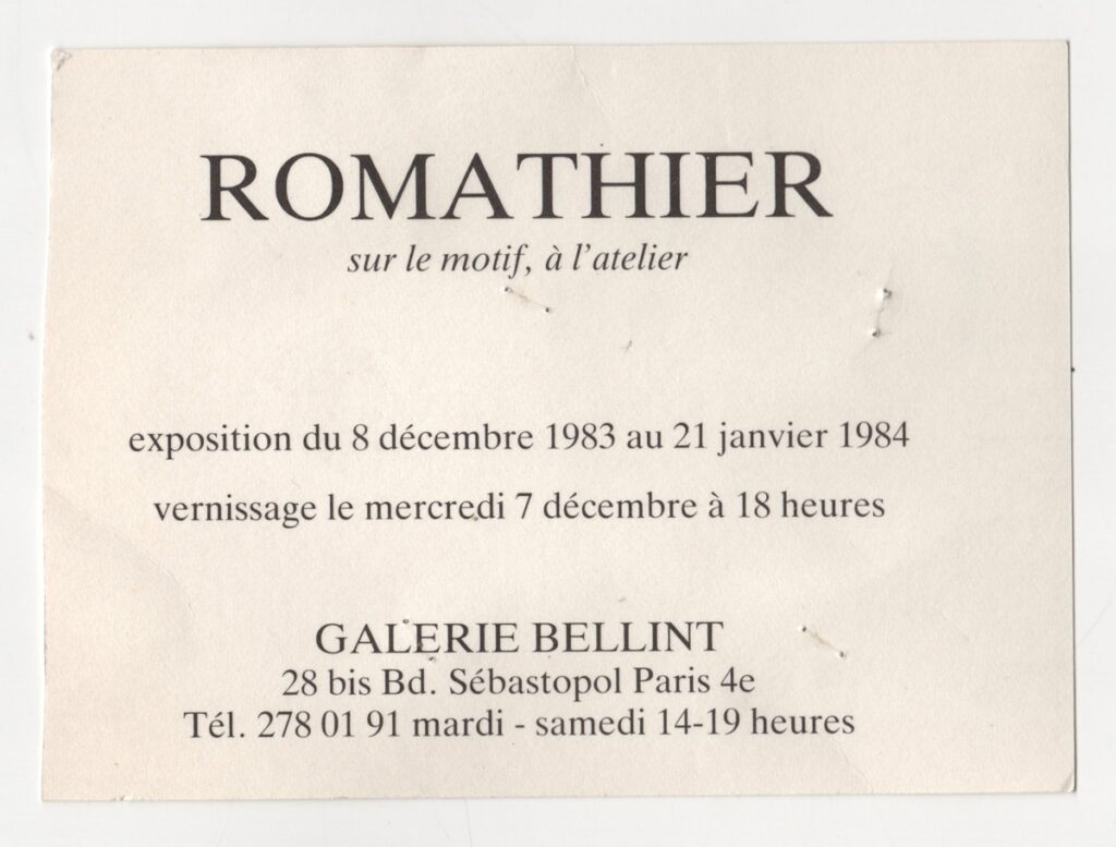 Έντυπο έκθεσης, στα γαλλικά, μονόφυλλο, χαρτόνι, 10,8×14,8 εκ. Αφορά την ατομική έκθεση του George Romathier με τίτλος “Sur le motif, à l’atelier” στο Παρίσι το 1983.