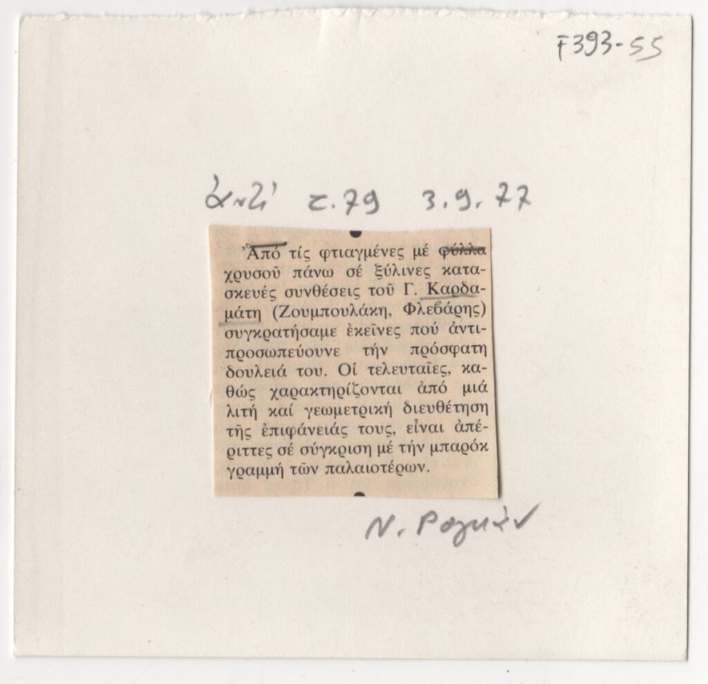 Απόκομμα, χαρτί συρραμμένο σε απόκομμα εντύπου, 11×11 εκ., στα ελληνικά, δημοσίευσης κριτικής έκθεσης του Ιωάννη Καρδαμάτη.