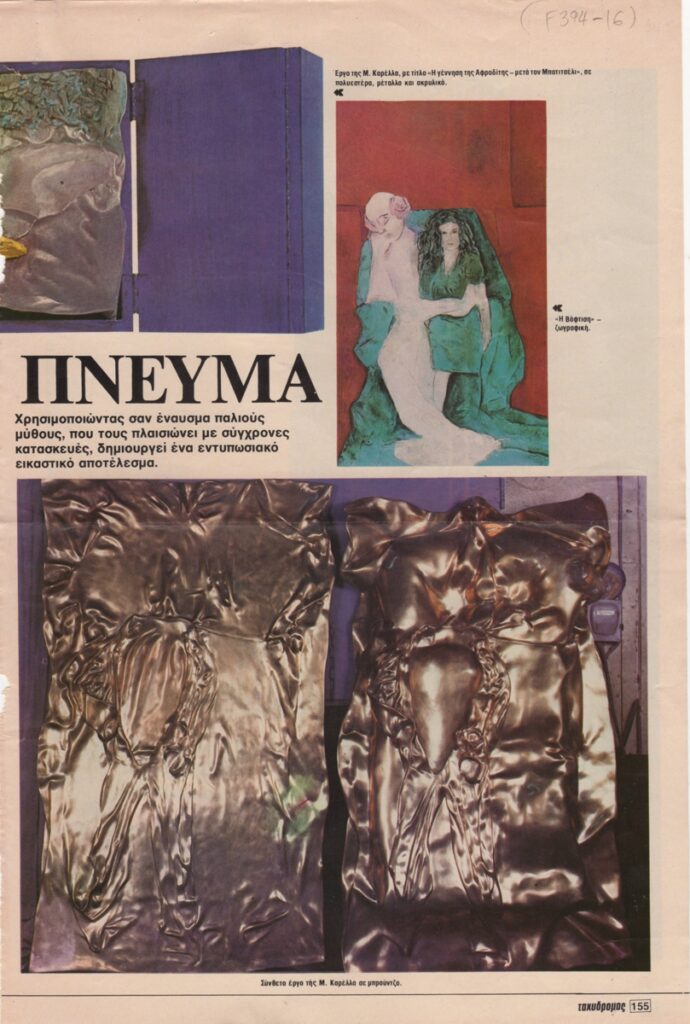 Απόκομμα, χαρτί ιλλουστρασιόν, 2 φφ, 32,5×21,5 εκ., στα ελληνικά, δημοσίευσης άρθρου για τη Μαρίνα Καρέλλα και το έργο της.