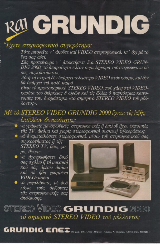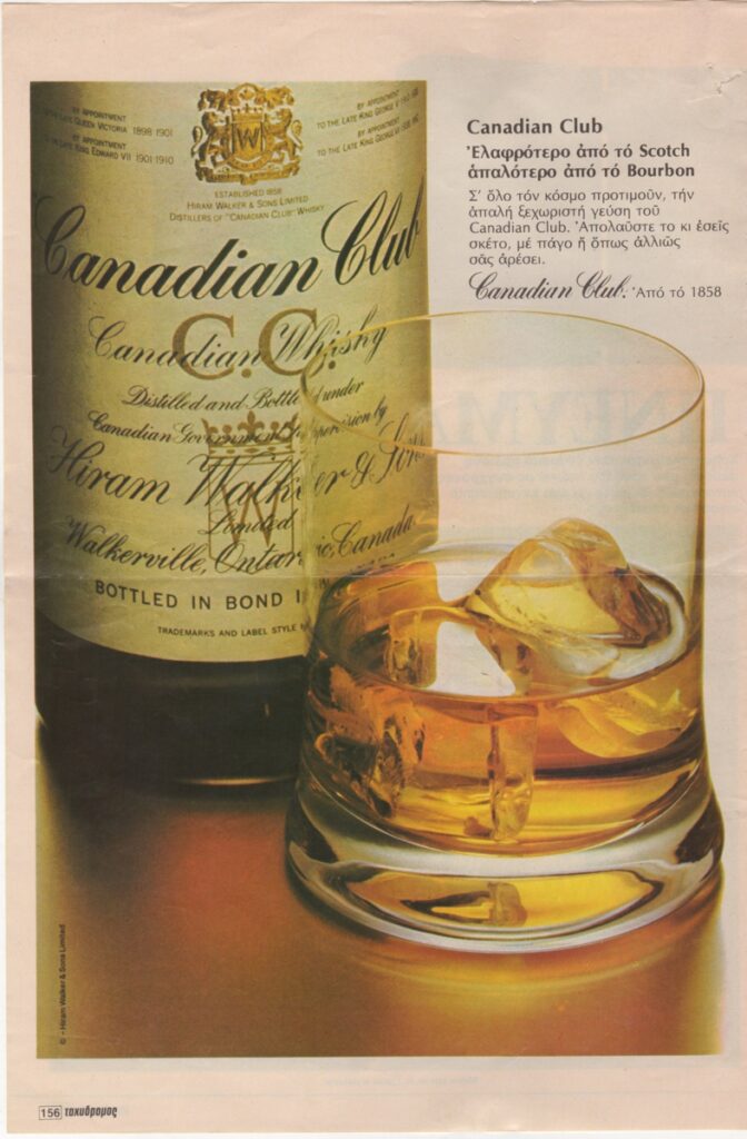 Στην πίσω όψη, διαφήμιση “Grundig” και ουΐσκι “Canadian Club”.