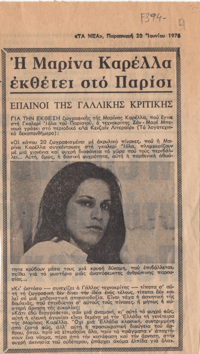 Απόκομμα, χαρτί, 19×11 εκ., στα ελληνικά, δημοσίευσης κριτικής ατομικής έκθεσης της Μαρίνας Καρέλλα, η οποία διεξάγεται στην Γκαλερί Ιόλα στο Παρίσι.