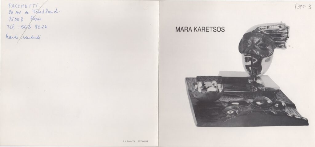Έντυπο, χαρτί δίπτυχο, 18,5×20 εκ., στα γαλλικά, ατομικής έκθεσης της Μάρας Καρέτσου, η οποία διεξάγεται στην γκαλερί Contemporary Graphics σε συνεργασία με την Galerie Faccheti.