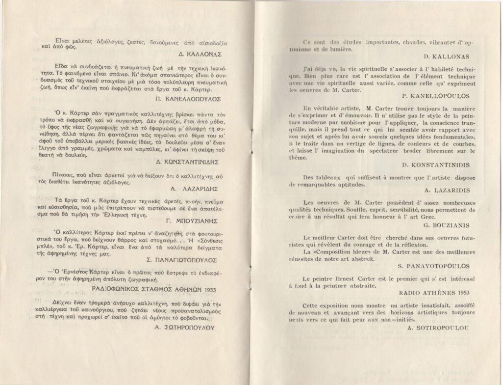 Κατάλογος, χαρτί, 4 φφ, 21×13,5 εκ., στα ελληνικά και γαλλικά, αναδρομικής έκθεσης του Ερνέστου Κάρτερ. Περιέχει τιμοκατάλογο των εκτιθέμενων έργων, λίστα εκθέσεων του καλλιτέχνη, και κρίσεις για το έργο του από τους: Δ. Καλλονά, Π. Κανελλόπουλο, Δ. Κωνσταντινίδη, Α. Λαζαρίδη, Γ. Μπουζιάνη, Σ. Παναγιωτόπουλο, Α. Σωτηροπούλου και Ραδιοφωνικό Σταθμό Αθηνών. Στο οπισθόφυλλο, κείμενο του καλλιτέχνη. Εικονογραφείται και φέρει επιγραφές.