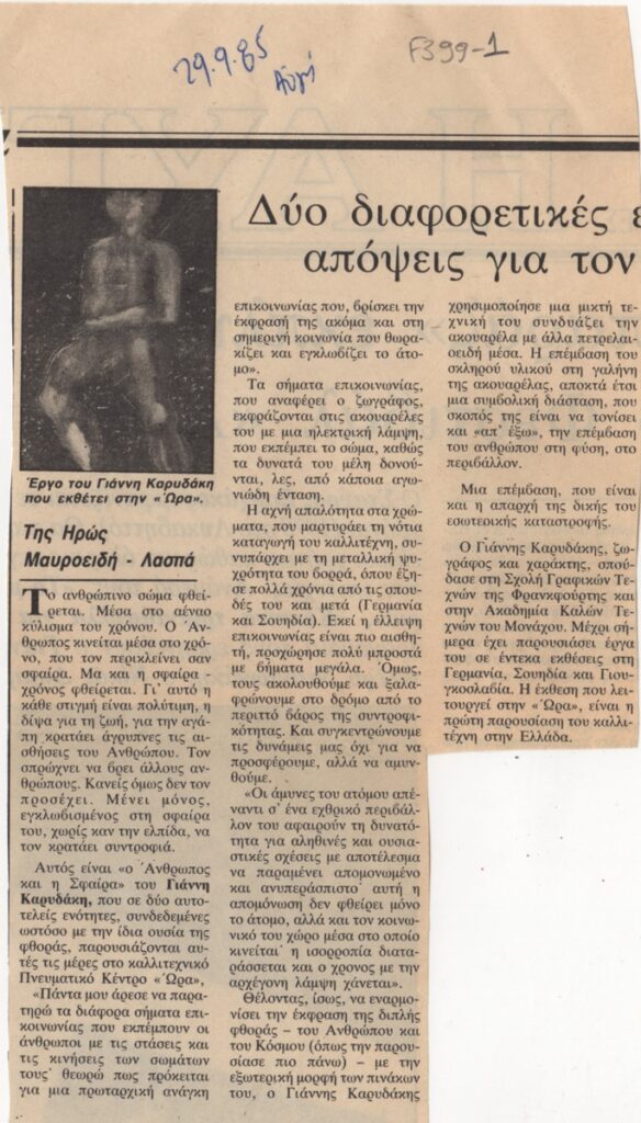 Απόκομμα, χαρτί, 23×13 εκ., στα ελληνικά, δημοσίευσης κριτικής έκθεσης του Γιάννη Καρυδάκη, για το έργο που παρουσιάζει σε ατομική του έκθεση στο Πνευματικό Καλλιτεχνικό Κέντρο Ώρα στην Αθήνα.