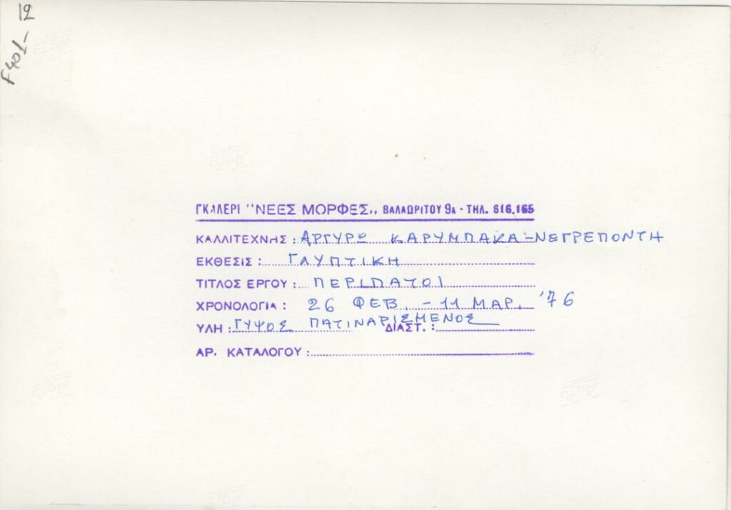 Φωτογραφία έργου της Αργυρώς Καρύμπακα-Νεγρεπόντη που παρουσιάστηκε σε ατομική έκθεση της στην Γκαλερί “Νέες Μορφές” στην Αθήνα. Στην πίσω όψη, σφραγίδα της Γκαλερί.