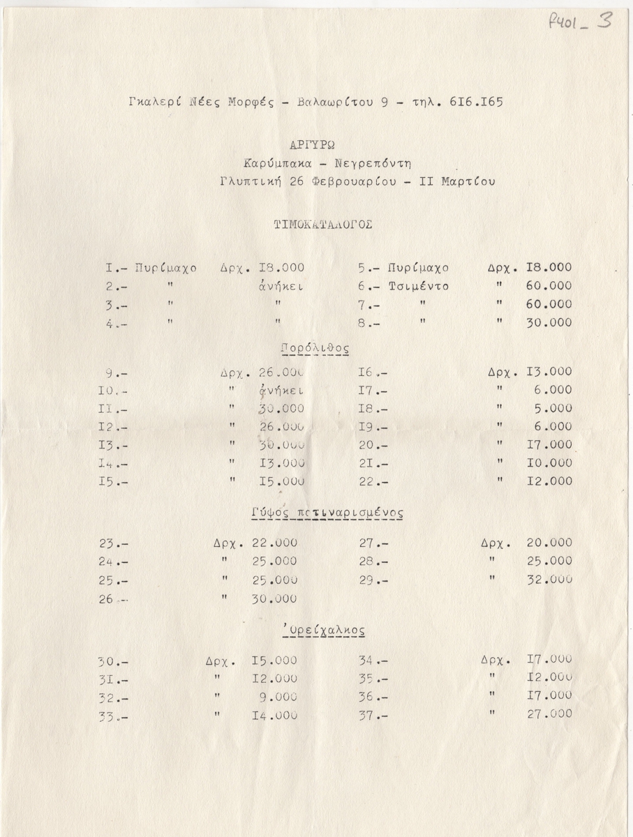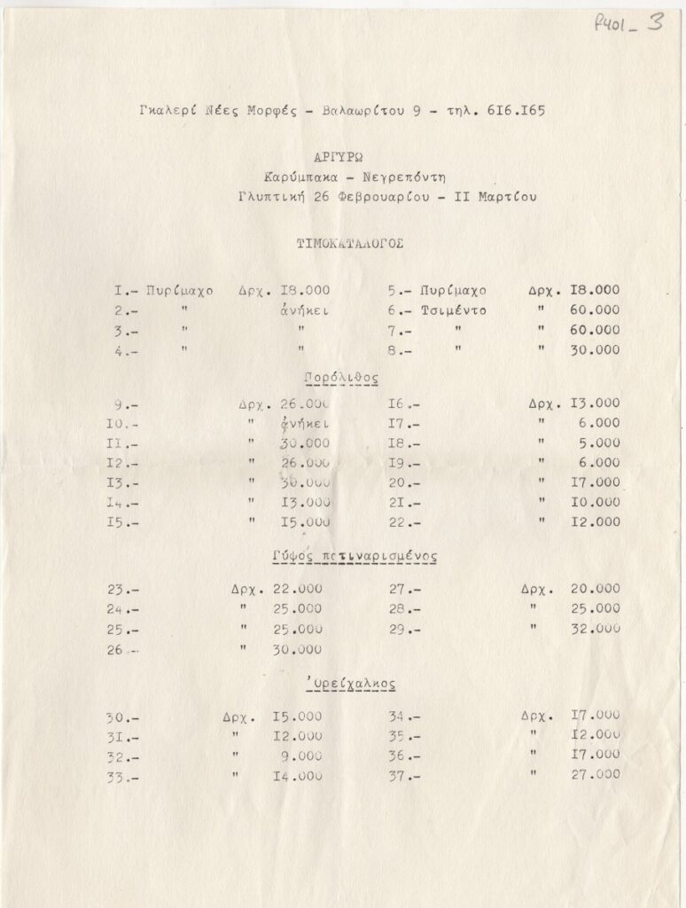 Τιμοκατάλογος, δακτυλόγραφο, χαρτί, 28,5×21,5 εκ., στα ελληνικά, έργων ατομικής έκθεσης γλυπτικής της Αργυρώς Καρύμπακα.