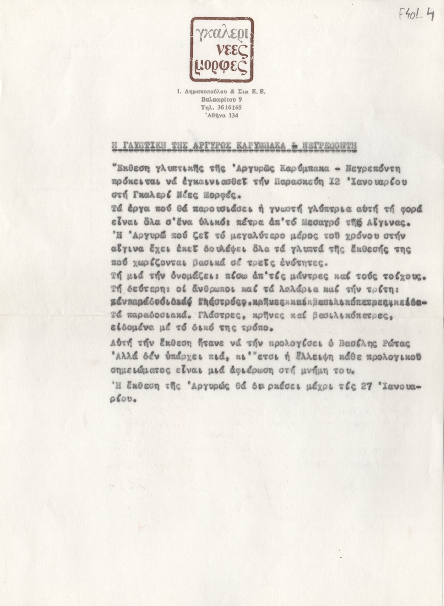 Δελτίο Τύπου, δακτυλόγραφο, χαρτί, 30,5×21 εκ., στα ελληνικά, ατομικής έκθεσης της Αργυρώς Καρύμπακα Νεγροπόντη, η οποία διεξάγεται στην Γκαλερί Νέες Μορφές στην Αθήνα το 1979.