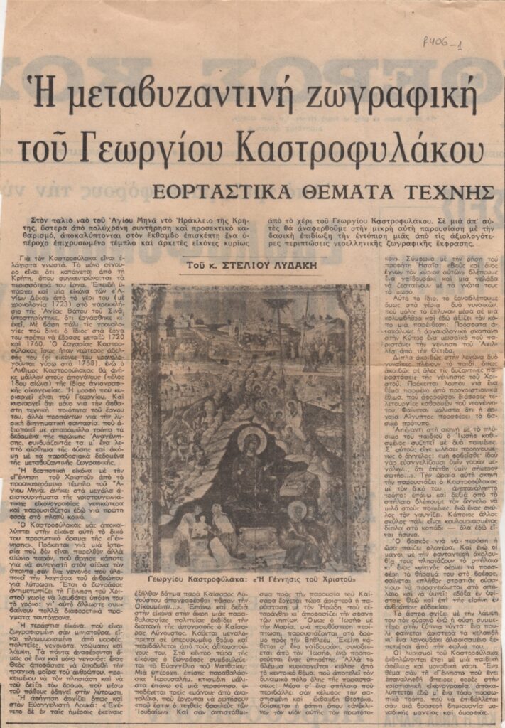 Απόκομμα, χαρτί, 30×20,5 εκ., στα ελληνικά, δημοσίευσης άρθρου αναφερόμενου σε τέμπλο που φιλοτέχνησε ο Γεώργιος Καστροφύλαξ στο ναό του Αγίου Μηνά στο Ηράκλειο Κρήτης.