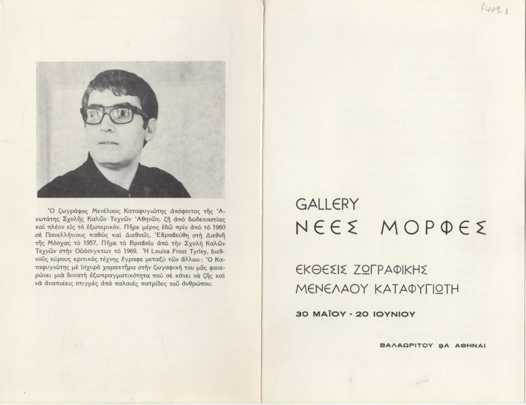 Έντυπο, χαρτόνι αναδιπλωμένο, 21,5×14 εκ., στα ελληνικά, ατομικής έκθεσης του Μενέλαου Καταφυγιώτη. Περιέχει κατάλογο έργων, κείμενο-κριτική του Men K., βιογραφικό σημείωμα και εικονογράφηση.