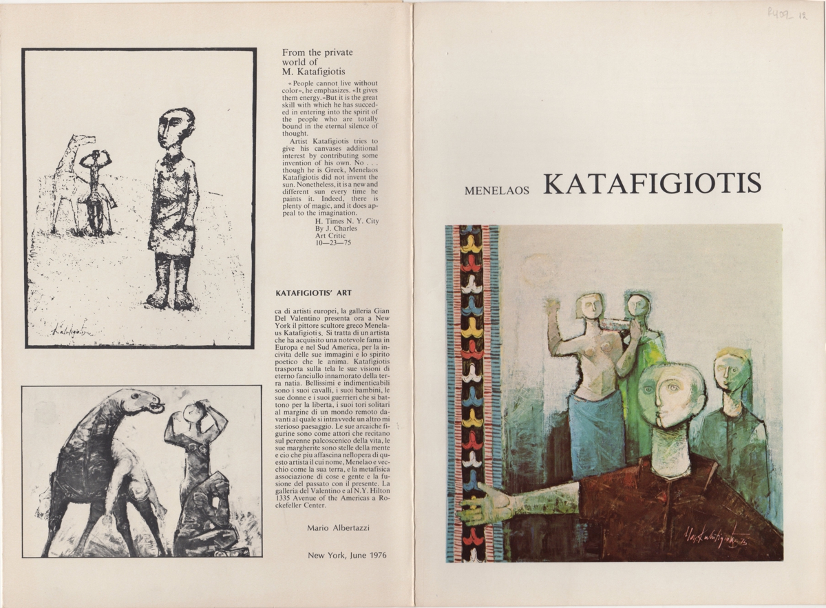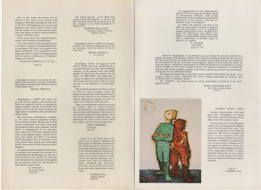Έντυπο, χαρτόνι δίπτυχο, 26,5x 18 εκ., στα αγγλικά, έκθεσης του Μενέλαου Καταφυγιώτη. Περιέχει βιογραφικό σημείωμα και κριτικές για το έργο του από την περίοδο 1961-1974 στον διεθνή Τύπο.